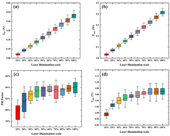 The parameters, such as open-circuit voltage (Voc), short-circuit current (Isc), fill factor(FF), and maximum output power (Pm), were extracted from the I–V curves of multiple laser photovoltaics with different irradiated areas and plotted as box and whisker chart in Figure 5. Figure 5a showed that the Isc decreased from 0.436 A at 100% illuminated area to 0.032 A at 10% illuminated area. Moreover, Isc varied linearly with the irradiation percentage, mainly because it is proportional to the incident light intensity. Figure 5b illustrated that the variation of Pm with illumination area corresponded to the variation of Isc; Figure 5c showed that the Voc increased from 0.99 V at 10% illuminated area to 1.07 V at 100% illuminated area. Besides, the Voc increased logarithmically with the increase of irradiation percentage, mainly due to the logarithmic relationship between Voc and Isc, as follows: