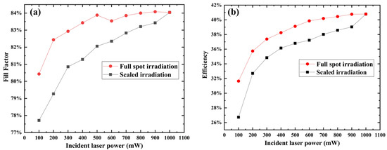 The incident laser power is reduced as the irradiated area decreases, lowering the efficiency. Therefore, we performed another set of control experiments to distinguish between the FF drop caused by non-uniform illumination vs that caused by the lower intensity illumination. In this experiment, a laser photovoltaic was randomly selected. First, as shown in Figure 6a, with a “full spot irradiation”, we tested the output characteristics of laser photovoltaics when the power is changed from 100 mw to 1000 mw under full spot irradiation. Then, as shown in Figure 6a with “scaled irradiation”, we tested the output characteristics of laser photovoltaics under 1 W/cm2 when the irradiation area varied from 10% to 100%. As shown in Figure 6a, FF reduction in “full spot irradiation” only includes the factor of the lower intensity illumination, whereas FF reduction in “scaled irradiation” includes two factors, non-uniform irradiation, and lower intensity illumination; the difference between the two curves at the same power is FF drop caused by non-uniformity. The larger the unilluminated region, the greater the reduction in FF. Figure 6b showed that the efficiency decreased from 40.8% at the full irradiated area to 26.7% at 1/10 irradiated area, a reduction of 14.1%, resulting from a combination of the reduced incident laser power and non-uniform irradiation. Comparing Figure 6b with Figure 5c,d, it was found that variations in conversion efficiency corresponded to variations in Voc and FF. In other words, the main factors decreasing laser photovoltaics conversion efficiency were Voc and FF, which is consistent with the efficiency calculation equation: