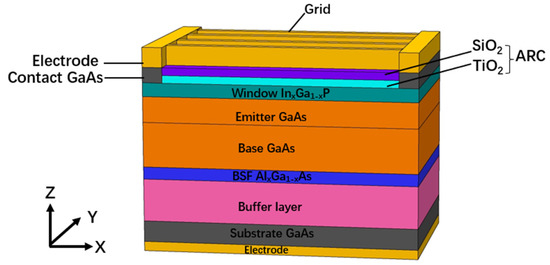 The 3D laser photovoltaics model was developed to simulate the effect of non-uniform irradiation on the output performance of laser photovoltaics. The model used a typical laser photovoltaics structure [15,16], which is shown in Figure 7. Table 2 listed the doping and thickness of the structure. The antireflection coating (ARC) layer consisted of 60 nm SiO2 and 90 nm TiO2, which could minimize reflectivity under illumination with an 808 nm laser beam. The Base and Emitter layers formed the absorption region, absorbing incident photons and separating photogenerated carriers. The Window and BSF layers formed diffusion barriers with the Base and Emitter layers, which could inhibit the diffusion and reduce the recombination rate of minority carriers at the interface. The Cap layer was highly doped GaAs, which formed a good ohmic contact with the upper metal layer.