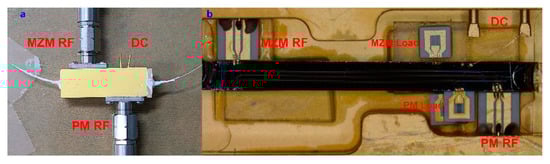 Figure 2 shows the photograph of the packaged LNOI modulation device. Thereinto, Figure 2a is the exterior appearance of the packaged device, and Figure 2b is the internal layout of the device. The internal layout of the device can refer to that in Figure 1b. The LNOI modulation chip is fabricated on a commercial LNOI wafer (NANOLN), which includes 500-μm-thick silicon substrate, 4.7-μm-thick buried oxide, and 500-nm-thick LN. The LNOI waveguide is with a ridge waveguide structure, which is fabricated by using electron beam lithography (EBL). The inclination angle of the side wall is 66°. The etching depth and the width of the LNOI ridge waveguide are 260 nm and 1.5 μm, respectively. In addition, the thickness of the Au electrode is 1200 nm. A 2-μm-thick SiO2 layer covers the electrode as the upper cladding. The length and the width of the device are 38 mm and 8.5 mm, respectively. For the RF packaging, the LNOI modulation chip, with a length of 16 mm and a width of 1.4 mm, is placed into a metal tube shell, where two RF coaxial connectors fixed on the side wall of the shell are used to load the RF signals into the shell. Two ceramic transmission lines are employed to apply the RF signals to the MZM and the PM, which are connected to the two RF coaxial connectors and the electrodes of the modulation chip via gold wires and gold tapes. At the end of the MZM and the PM electrodes, there are matching resistors to reduce the RF signal reflection. For the optical packaging, customized single-channel fiber arrays (FAs) are employed to align the PMFs with the spot-size converters at the input and the output ends of the LNOI modulation chip, and they are fixed by using ultraviolet curing adhesive.
