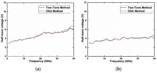 Through biasing the MZM in the packaged device at its maximum transmission point, the fiber-to-fiber insertion loss of the device is measured to be 6.97 dB, where the fiber-chip coupling loss is about 2.1 dB/facet, and the propagation loss in the waveguide is 0.8 dB/cm. This value is smaller than that introduced by cascading a LN-based MZM with a LN-based PM, which is favorable for enhancing the power of the generated OFC. The half-wave voltages of the MZM and the PM, at different modulation frequencies, are independently measured by using the optical spectrum analysis (OSA) method [] and the two-tone modulation method []. In the measurement, a DFB-LD, centered at 1555.6 nm and with an output power of 12.7 dBm, is employed to generate the CW optical carrier. The DC bias voltage of the MZM is finely adjusted by using a high-accuracy power supply (Keithley 2200-30-5) to guarantee that the MZM works at its quadrature point. Figure 3a,b present the half-wave voltages of the PM and the MZM, respectively, in which the red lines are measured by using an optical spectrum analyzer (YOKOGAWA AQ6370C), and the blue lines are measured by using a four-port vector network analyzer (Keysight N5225A). The measurement results indicate that the half-wave voltages obtained by using the two methods fit in with each other. Hence, the measurement results in Figure 3 are credible, so they are used to optimize the OFC generation.