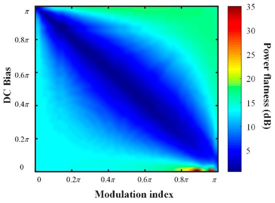 Simulated power flatness of the generated OFC under a different modulation index and DC bias of the MZM.