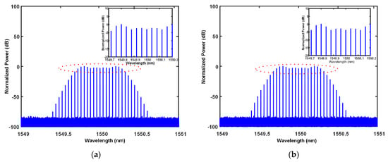 Numerical simulation is implemented to optimize the OFC generation, based on cascaded MZM and PM by using the Fortran software. The simulation is based on the transmission equations of the MZM and the PM. In the simulation, the microwave signals applied to the two modulators are synchronized with each other. In addition, the spectrum of the OFC is calculated by implementing fast Fourier transform (FFT) of the temporal optical field. Figure 4 shows the power flatness of the generated OFC under a different modulation index and DC bias of the MZM. It can be seen, from Figure 4, that the combinations of modulation index and DC bias, in the dark blue area, are beneficial for enhancing the power flatness of the OFC. Figure 5 exhibits the simulated spectra of the generated OFCs. Thereinto, in Figure 5a, the MZM is biased at and with a modulation index of . In Figure 5b, the MZM is biased at (i.e., its quadrature point) and with a modulation index of . These two conditions are in the dark blue area of Figure 4. It can be seen, from the insets of Figure 5, that the power flatness of the OFC is smaller than 5 dB.