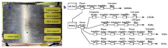 In the OFC generation experiment, a DFB-LD, centered at 1555.6 nm and with an output power of 12.7 dBm, is employed to generate the CW optical carrier, whose pigtail is a polarization-maintaining fiber with a core diameter of 6.5 μm. The RF signals applied to the MZM and the PM are generated by a home-made multi-port microwave source as shown in Figure 6. Thereinto, Figure 6a exhibits the exterior appearance of the microwave source, and Figure 6b presents the internal architecture of the microwave source. The single-tone RF signals from the microwave source at 5 GHz are synchronized by using a single 100-MHz oven-controlled crystal oscillator (OCXO) integrated in the microwave source, which guarantees the stability of the generated OFC. The output RF signal power and the phase difference between the single-tone RF signals can be finely tuned via the electrically-controlled variable attenuator (VOA) and RF phase shifter integrated in the microwave source, which can help to optimize the power flatness of the generated OFC.