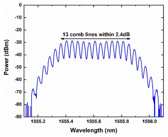 Figure 8 shows the measured spectrum of the generated OFC after 20-dB optical attenuation. It can be seen that 13 comb teeth with a power flatness of 2.4 dB are obtained. The power flatness is mainly limited by the relatively large power tuning step of the microwave source, i.e., 0.5 dB. If a microwave source with a higher power tuning accuracy is used, the power flatness of the OFC can be further improved. It should be noted that the number of the comb teeth can be further increased through applying a large RF signal power to the PM, which will not introduce an extra loss into the optical link. In fact, the maximum output power of the microwave source is up to 33 dBm. Nevertheless, this high power is not used in the experiment since the matching resistor at the end of the PM electrode, in the present packaged device, cannot handle such a high power. The modulation device with a higher RF signal power handling capacity is in fabrication, which is expected to generate more than 20 comb teeth with an excellent power flatness. Finally, it should be pointed out that the packaged LNOI modulation device can work in the frequency range up to 40 GHz as shown in Figure 3. Hence, it can be used to generate OFCs with comb spacing up to 40 GHz if the corresponding microwave source is employed.
