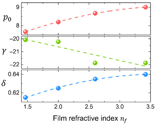 where and , , and are adjustable parameters, which depend on the film refractive index . To augment the NLEM model so that it describes all refractive indices, we repeat the above process for all modelled film indices and extract the index dependent parameters, as shown in Figure 3. These are parametrized as