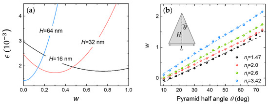 (a) The error function between FDTD and NLEM as a function of the weight parameter w for 3 different roughness heights. (b) The linear scaling of the weight factor w with pyramid half-angle (see inset) for the 4 different film indices considered.