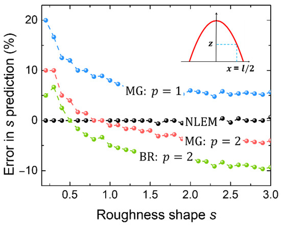Different effective medium models are tested for predicting the roughness shape , by fitting to corresponding FDTD results (for H = 32 nm). The NLEM model is the only one offering error-free prediction for all roughness shape values.