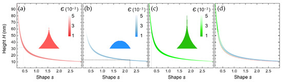 Free fit results of the NLEM model assuming both height H and shape s as free parameters. In these threshold images, color-coded is the error function. The white space represents (, ) points for which the error is higher than 5 × 10−3. The dashed lines point to the FDTD system they try to fit: (a) , , (b) , , (c) , . A continuous band of small errors traces through optically similar combinations of roughness height and shape. This is proved in (d), where the overlayed error lines fall almost perfectly on each other.