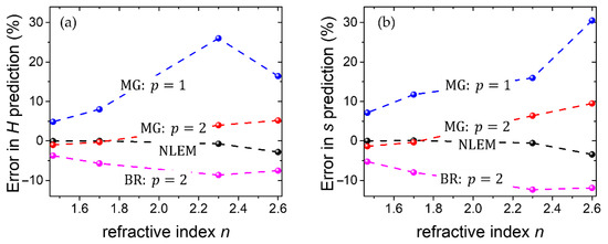 To further show that our model correctly predicts the morphology of the thin film roughness, we applied it to two test cases using material indices and layer thicknesses other than the ones used to parametrize our model. In the first case, the substrate of the structure is Si and films of thickness 500 nm with four different values of the refractive index are placed on top of it. The relative error in the predicted and value as a function of the real and value used in the FDTD simulation are shown in Figure 8, along with the results of different effective medium models. We find that overall, the prediction errors of the NLEM are quite small and always smaller than those of other EMTs, however, at increasing index, the NLEM error also increases. This could be explained by the increased difficulty in obtaining accurate effective media when the contrast between materials (i.e., air and dielectric) increases. This however does not invalidate the usefulness of our model as it still outperforms all other traditional EMTs.