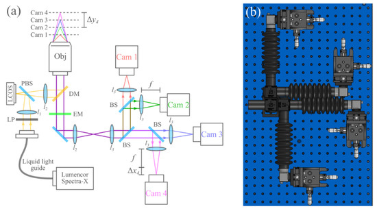 (a) Overview of the optical system. ∆x4 and ∆y4 indicate the sensor defocus and sample defocus of camera 4, respectively. LP, linear polarizer; LCOS, liquid crystal on silicon microdisplay; PBS, polarizing beam-splitter; DM, dichroic mirror; EM, emission filter; BS, 50–50 beam-splitter; l1, 50 mm FL; l2, 180 mm FL Olympus tube lens (part SW-TLU); l3, 175 mm FL. (b) To-scale model of the four-camera detection system.