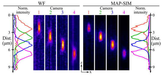In this scenario, applying this correction factor yields an actual slice spacing of 117 nm. With this correction, the orthogonal projections of the resulting data, shown in Figure 2, indicate that the bead’s images are displaced axially by an amount close (<5% error) to that predicted by Equation (1). Here, each camera was displaced in 0.9 mm increments, and the measured magnification of the system was 30.86×. Using these values with Equation (1) yields a predicted slice increment of 1.43 µm in the sample. This aligns very well with the average slice spacing measured from the data in Figure 2 (1.4 µm) and fairly well with the individual displacements between focal planes in the same data (1.42, 1.36, and 1.46 µm). Additionally, the measured axial resolution of the MAPSIM reconstruction in these data (1.24 µm full width at half maximum (FWHM)) was ~25% better than that of the widefield reconstruction (1.66 µm).