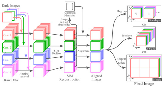 After alignment of the images from each camera, the data are organized into four separate image stacks (one for each camera). The process to reconfigure these data into their final form is dependent on the imaging mode. For 3D time-lapse imaging, the four image stacks can be regrouped into multiple image stacks, one for each time period. For Z-stacks of 3D images, interlacing the four image stacks into a single image stack produces the final 3D image. To generate 3D mosaics, the four camera image stacks must be first regrouped into multiple image stacks, each containing one 3D image tile. Similar to the time-lapse mode, each of these image stacks will contain four slices, one from each camera. These 3D images can then be stitched into the final image. We performed image stitching using Preibisch’s plugin for ImageJ [43]. The entire data processing procedure is summarized in Figure 3.