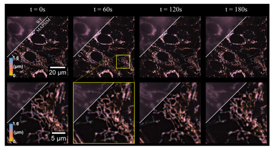 To demonstrate the time-lapse imaging mode of our system, we imaged mitochondrial dynamics in HEP-G2 cells over 3 min. Hence, 3D images of a 88 × 88 × 1.6 µm region with an exposure time of 250 ms were acquired at 3 s intervals, resulting in 60 total frames, four of which are shown in Figure 4 (see Visualization 1 for a video containing all frames of the time-lapse). As evident in the figure, MAPSIM improves the resolution compared to the WF reconstruction and reduces out-of-focus light. In these images (Figure 4), the average SNR improved from 28.9 dB (WF) to 42.5 dB (MAPSIM), as measured by frequency-domain methods [44]. Due to the use of the four-camera detection system, all images were acquired with no physical z-movement of the sample and, with our SIM system, no moving parts during acquisition. To display the 3D information in Figure 4, Figure 5 and Figure 6, the images were depth-coded using the isolum lookup table [45].