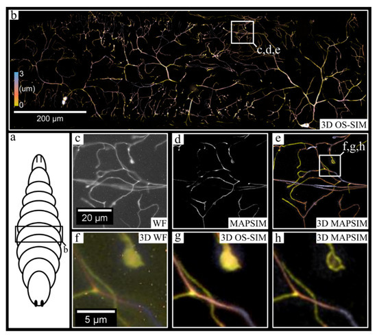 Next, we demonstrated the 3D mosaic imaging mode by imaging CD4-tdTomato labeled neurons in Drosophila melanogaster larvae (Figure 6). The 6957 × 10,151 pixel (~800 × 1150 × 3 µm) image was acquired in under 10 min, with each frame having an exposure time of 1500 ms. In these images (Figure 6), the average SNR improved from 18.3 dB (WF) to 45.1 dB (MAPSIM). For visualization purposes, this image was rotated, cropped, and color-coded to the region (~1000 × 300 × 3 µm) shown in Figure 6b. As shown in Figure 6d, the MAPSIM data from a single camera alone show improved resolution over the widefield reconstruction (Figure 6c), but MAPSIM’s optical sectioning prevents accurate visualization of neurons that deviate from the image’s narrow depth of field. When all four cameras are included (Figure 6e), the data not only provide useful depth information, but also have a larger effective depth of field than that of a single z-plane. This ability of the four-camera system to enhance the axial FOV of the montage substantially reduces complication during acquisition, as relatively flat samples can be entirely imaged without the need for autofocus systems or slide tilt/deflection correction.