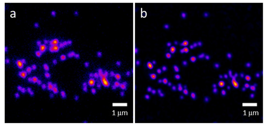 - Ovesný, M.; Křížek, P.; Borkovec, J.; Švindrych, Z.; Hagen, G.M. ThunderSTORM: A comprehensive ImageJ plug-in for PALM and STORM data analysis and super-resolution imaging. Bioinformatics 2014, 30, 2389–2390. [Google Scholar] [CrossRef]