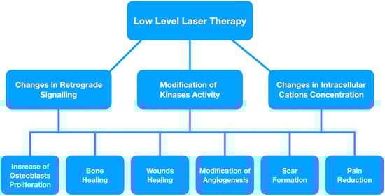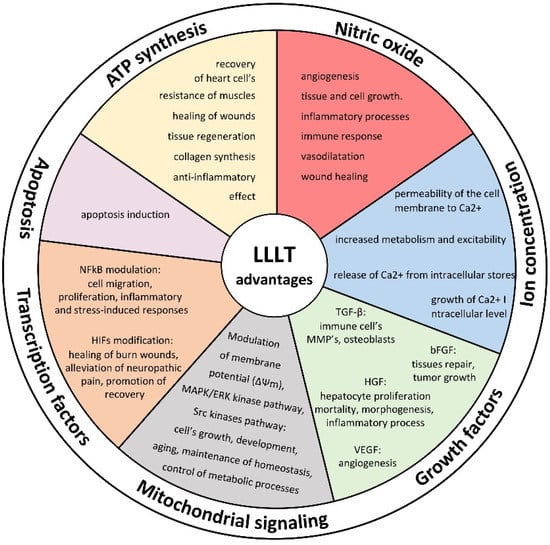 Additionally, even other parameters of LLLT seem to have an impact on its therapeutic effect. Yet, a full discussion regarding this issue is beyond the scope of this manuscript. As a short example, we can use the laser operating mode. Although continuous-wave (CW) irradiation has been a gold standard in LLLT, some studies have suggested that pulse wave (PW) [] may be superior to CW, particularly in regenerative applications. However, no strong evidence supports this theory [], and therefore, future studies focused on this topic are necessary. Other, more specific effects on cell life processes are discussed in the next part of the manuscript.