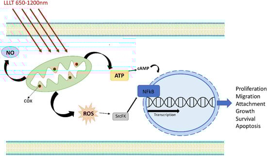 Laser irradiation also affects cell biology by modulating transcription factors. One of the best-known transcription factors, whose activity is changed by LLLT is nuclear factor-kappa B (NFkB). NFkB regulates many cellular functions (migration, proliferation, inflammatory and stress-induced responses). This protein complex remains in a non-active state, and under the influence of stimulating factors, it turns into the active state []. This change occurs without any additional protein synthesis, allowing classification in the “rapid-acting” primary transcription factors category. There are many well-known inducers of NFkB activation, such as tumor necrosis factor-alpha, ROS, bacterial lipopolysaccharides, interleukins, and low-level laser therapy [,]. In the case of LLLT stimulation, we observe a typical reaction consistent with the Arndt–Schulz law. The appropriate dose of radiation leads to the activation of the enzyme and increases the proliferative and anti-inflammatory potential [,]. However, exceeding the radiation dose led to increased oxidative stress and an over-abundant activation of NF-κB [].