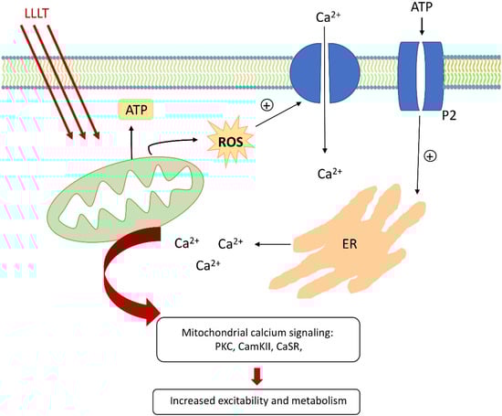 Calcium ions are an important link in intracellular signal transductions. They are involved in many intracellular processes, and changes in their concentration affect the activity and viability of all cell cultures. LLLT has been shown to increase the permeability of the cell membrane to calcium, leading to an increase in its intracellular level [,]. Another mechanism responsible for the increase in calcium levels after LLLT is related to the increased release of Ca2+ from intracellular stores []. An experimental study by Lavi et al. [] suggests that, within the appropriate radiation range, the increase in the calcium level is directly proportional to the increase in the radiant energy density, measured in J/cm2, as well as proportional to the increase in reactive oxygen species generation. The authors also suggest a direct relationship between the intracellular calcium concentration and the levels of ROS. They assume that the mechanism of calcium channel activation is directly related to the production of ROS under the influence of visible electromagnetic radiation. What needs to be emphasized is that laser irradiation increases intracellular calcium levels not only by a ROS-dependent mechanism. Furthermore, LLLT, via the increased production of ATP, may activate multiple subtypes of nucleotide (purinergic) P2 receptors, resulting in the increased level of intracellular calcium levels [,]. It is noteworthy that calcium-related signaling pathways include mitochondrial calcium signaling, calcium-sensitive adenylyl cyclase, calcium-sensitive enzymes such as protein kinase C (PKC), calcium-dependent kinase II (CamKII), and extracellular calcium-sensitive receptor (CaSR). Their enhanced activation leads to various changes in the basic activity of the cells and can be summarized as increased metabolism and excitability. This effect affects various cell cultures—myocytes [], mast cells [], fibroblasts [], or reproductive cells []. Low-level laser therapy has an impact on the local concentration of sodium and potassium ions. Laser irradiation in a dose-dependent manner alters the ATPase activity of the membrane ion pumps. Depending on the radiation parameters used, an increase or decrease in the Na(+), K(+) ATPase activity is observed []. Even though the exact mechanism of this phenomenon has not been fully understood, one study suggests that it may be responsible for the analgesic effect of LLLT []. Figure 4 shows the basic changes in ion concentration triggered by LLLT.