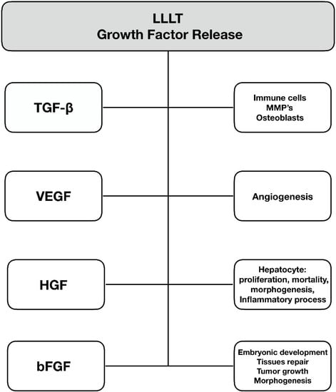 Low-level laser therapy affects the activity of several growth factors. This molecular effect is widely used in the clinical application of LLLT. Figure 5 shows basic post-LLLT changes in growth factor activity.