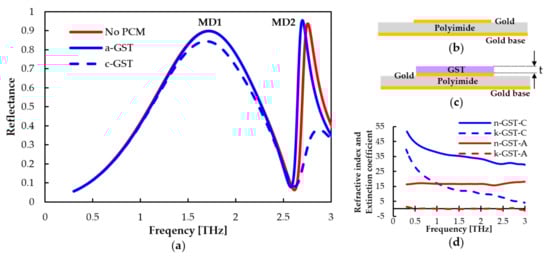 Next, one-micron thick GST (t) is integrated into the unit cell structure by placing it on top of the gold periodic pattern, as shown in Figure 2c (GST layer is shaded in violet). The refractive index and extinction coefficient [] of GST are shown in Figure 2d. The blue lines represent the indices when GST is in the crystalline state (c-state), with solid and dashed lines as refractive index and extinction ratio, respectively. Similarly, when GST is in an amorphous state (a-state), its refractive indices and extinction ratio are shown by red solid and dashed lines, respectively. After adding the GST to the unit cell structure, its reflectance spectra are shown in Figure 2a by blue lines. The numerical results indicate that the proposed phase change metasurface can provide two separate reflectance modes when the GST is in a-state, which is similar to the condition without GST (shown by a solid red line). Note that the MD1 curves overlap, so only the blue curve is visible. The reflectivity of the first mode is 0.90, which is located at 1.72 THz, and the second mode is located at 2.70 THz with a reflectance value of 0.96. When the phase changes from a-state to c-state, the simulation result is shown by a dashed blue line, as in Figure 2a. The first mode remains almost unchanged during the phase transitions. The resonant peak slightly shifts from 1.72 THz to 1.69 THz, with its reflectance value dropping to 0.85. However, a significant change in its reflectance profile value in the second mode is observed, decreasing from 0.94 to 0.16 at 2.70 THz. This gave a reflectance contrast (RC) of 0.78 between amorphous and crystalline states, which can be simply calculated as the difference between reflectance values of a-state and c-state at the considered frequency (RC = Ra − Rc).