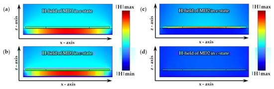 To understand the behavior of those two resonant frequencies, their field distributions are examined and shown in Figure 3. For the first mode MD1, during the a-state of GST, the side view of the magnetic field distribution in Figure 3a shows the power confinement mostly within the polyimide layer, and the presence of the maximum value is also evident in this dielectric material. Therefore, this mode can be called the magnetic dipole (MD) []. When GST switches from a-state to c-state, the magnetic field distribution remains confined in the polyimide layer, as shown in Figure 3b. Clearly, the first mode field distribution is mostly within the dielectric layer and has not been influenced by the GST phase transition. On the contrary, the maximum magnetic field distribution of the second mode appears in the GST layer when the GST is in a-state (Figure 3c). This is also known as the MD. However, when the GST is changed from a-state to c-state, there is a significant difference in the refractive index and extinction coefficient between the two states (as shown in Figure 2d) in the area where most of the energy is confined. This leads to a profound change in the magnetic field distribution for this mode, which then causes a decrease of the second mode, MD2, during the phase transition. To avoid the confusion between the magnetic dipole modes of these two resonances, the notations “MD1” and “MD2” modes are used to designate the magnetic dipoles for the first and the second peaks, respectively.