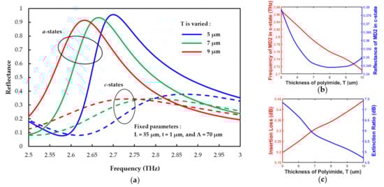 Initially, the polyimide thickness (T) is varied for T = 5 µm, 7 µm, and 9 µm, and corresponding reflectances are shown in Figure 4a using blue, green, and red lines, respectively. Reflectances for a-state and c-state of GST are shown by solid and dashed lines, respectively. As there is little change in the MD1, we then monitor only the MD2 around 2.5–3.0 THz to investigate the behavior of the peak and drop of MD2 during the phase transition. In a-state (solid lines), the resonant frequencies of MD2 are 2.70, 2.68, and 2.63 THz, corresponding to the reflectivity values 0.96, 0.93, and 0.91 for the T = 5, 7, and 9 µm, respectively. To see the effect of polyimide thickness, T, the resonant frequency and reflectance value of c-state represented in red and blue lines, respectively, are shown in Figure 4b. The reflectance of the MD2 mode is inversely proportional to the polyimide thickness as the frequency is shifted to the lower values, or polyimide becomes thicker. The minimum reflectivity value represented in the blue line (Figure 4b) is found to correspond to a polyimide thickness of around 8 µm. For the switching performance of MD2, showing the contrast between amorphous and crystalline phases, the result is investigated by insertion loss and extinction ratio using Equations (4) and (5), and the values are illustrated in Figure 4c. The relation between IL and T shows that when the thickness of polyimide increases, the insertion loss also increases, whereas the ER decreases. At the same time, a larger contrast between a and c-states occurs when the polyimide becomes thicker.