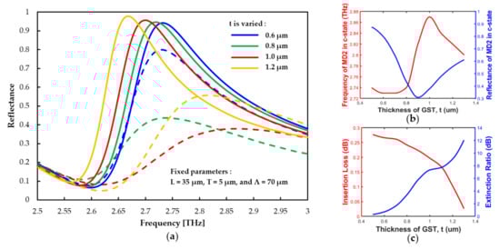Next, the performances of the designed material were also studied as a function of the GST thickness (t). The variation of reflectance for GST thicknesses t = 0.6 µm, 0.8 µm, 1.0 µm, and 1.2 µm are shown in Figure 5a by blue, green, red, and yellow lines, respectively. Reflectances for a-state and c-state of GST are shown by solid and dashed lines, respectively. The frequency-dependent reflection graph is again focused on the region of the MD2, regarding the behavior of the switchable property. For a-state, the MD2 mode resonant frequency is shifted to a smaller frequency when the GST is thicker. For a-state, the MD2 peaks are found to locate at 2.73, 2.72, 2.70, and 2.68 THz with their reflectivity values of 0.94, 0.95, 0.96, and 0.98 for the GST thickness of 0.6 µm, 0.8 µm, 1.0 µm, and 1.2 µm, respectively. The overall performance of the MD2 in c-state illustrated in Figure 5b shows the shifted resonant frequency of MD2 represented by a red line. It shows that the resonant frequency increases and reaches a maximum value of 2.87 THz when the GST thickness increases from 0.8 to 1.0 µm. The following resonant frequency then decreases when the thickness of the GST is greater than 1.0 µm. The reflectivity value of MD2 in c-state is shown by a blue line (Figure 5b). It is evident that the reflectivity value decreases from 0.9 to 0.3 when the GST thickness increases from 0.5 to 0.9 µm. After reaching the minimum value, it subsequently increases when the GST thickness is greater than 0.9 µm. Next, the performance of the phase transition between two states is shown in Figure 5c, where insertion loss and extinction ratio are shown by red and blue lines, respectively. It is evident that for the thicker GST, the insertion loss is lower, whereas the ER becomes higher.