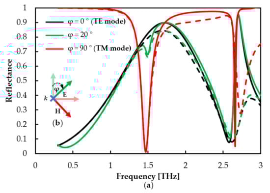 Next, the effect of the polarization state of an incident beam is investigated and presented in Figure 8a with black, green, and red lines when φ is at 0°, 20°, and 90°, respectively. As shown in the figure, the polarization angles at 0° and 90° correspond to the TE and TM polarization modes, respectively. Here, solid and dashed lines describe the GST in a-state and c-state, respectively. When φ is 0° (TE), the solid black line shows two resonating reflectances at 1.71 and 2.76 THz. At the polarization angle of 20°, the reflectance is described by a solid green line. The reflectance is almost the same as TE mode, but there are two dips appearing around 1.5 THz (clearly be seen) and 2.7 THz (hardly be seen). When the polarization angle increases to 90° (TM), these two dips become more apparent.