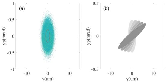 Transverse phase space distribution of electron beam: (a) definition of emittance, area (red line) = emittance × π; (b) phase space distribution of electron beam with different phase.