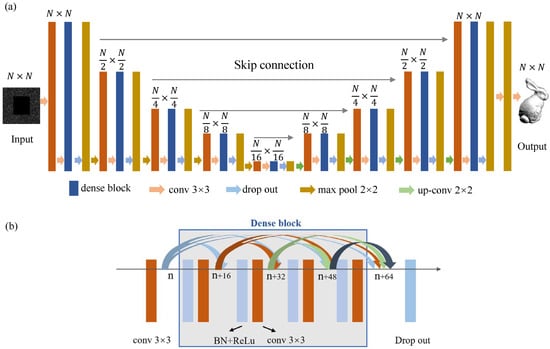 The deep-learning-based reconstruction model conforms an encoder–decoder frame and the detailed network structure is given in Figure 2a. The left part acts as an encoder, which consists of four dense blocks connected by max-pooling layers for downsampling. As seen from Figure 2b, each dense block contains multiple layers, in which each layer consists of batch normalization (BN), the rectified linear unit (ReLU) non-linear activation function, and the convolution (conv) operator. The high-level feature is extracted layer by layer from the input speckle with the encoder process, which takes advantage of the down-sampling process to enhance robustness, avoid overfitting, and reduce computation load. The right part plays a role in the decoder by upsampling operation. During the upsampling process, the feature map of the encoder path is copied and cropped to the corresponding symmetrical decoder path to preserve high-frequency information. After the decoder path, an additional convolutional layer and a fully connected layer followed by the last layer produce the output. It should be noted that the number of downsampling layers and upsampling layers changes according to the input size. Specifically, the number of downsampling layers and upsampling layers should be decreased to guarantee that the  is an integer when .