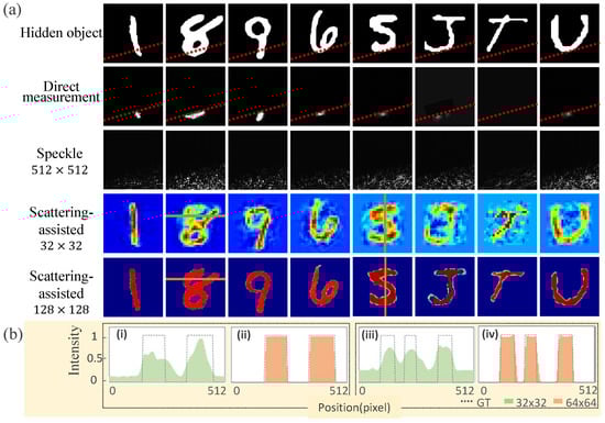 (a) The result of hidden object with both direct imaging and proposed scattering-assisted computational imaging method; (b) intensity plots from one line of objects corresponding to the intensity of ground truths (GT), where (i)–(ii) respond to the imaging results of ‘8’ using blocks with 32 × 32 and 128 × 128 pixels, respectively, and (iii)–(iv) respond to these of ‘S’.