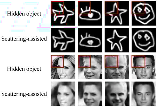 In addition, more complicated images like stick figures and faces are set as objects to perform scattering-assisted computational imaging. The corresponding results are shown in Figure 5, and the red box represents the remaining view due to the opaque barrier. The proposed method has great performance for eliminating the in-line occlusion effect in spatial sparse targets while failing to retrieve the detail feature in humans’ faces. In the future work, we will explore a more effective neural network architecture or a more powerful technique to improve the reconstruction performance for complicated non-sparse images.