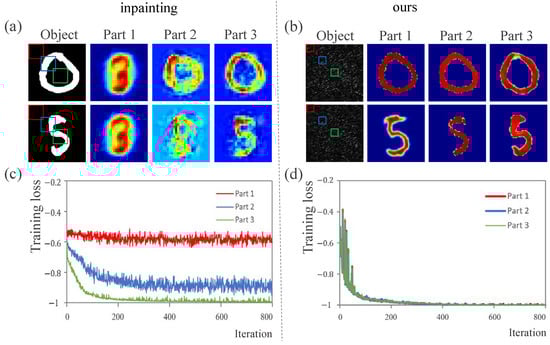 Figure 8a,b demonstrates the influence of occlusion positions, where three visible blocks of the same size are set as different-colored boxes show. In addition, corresponding results of digit ‘0’ are given as representative examples. The quantitative analysis is given in Figure 8c,d. For the inpainting method, when the selected visible region nears the central part, the loss of the inpainting method decreases obviously as Figure 8c shows, which is because the center tends to have richer target information than the corner. This clarifies that the position has a significant influence on the result of image inpainting. For our proposed method using speckle patterns, different occlusion positions have a little effect on reconstruction results as Figure 8d shows, implying that the method is viewing position-invariant. That is, our method not only performs well with the limited view but also is robust to the occlusion positions.