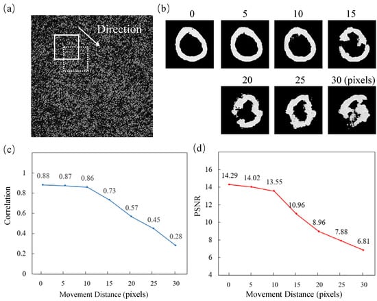 Moreover, we further discuss the generalization performance of a single scattering-assisted network model when the position of the opaque barrier changes. We change the remaining view described as the solid box with 128 × 128 pixels and use the corresponding speckle block to train the reconstruction model, and then move the window along the direction of the arrow to crop the speckle as the test data. The movement distances are separately set as 0, 5, 10, 15, 20, 25, and 30 pixels. As seen from the result in Figure 9, the longer the movement distance is, the lower the image quality is. However, when the movement distance of the remaining view is under 10 pixels, the single well-trained model still can retrieve the high-quality image of the hidden object from the speckle block. Therefore, the proposed scattering-assisted computational imaging method is reasonably robust against the small change in the occlusion position caused by the camera jitter and other disturbances, performing great generalization performance and feasibility in practical obstacle-avoidance applications.
