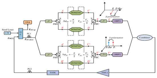The two polarization signals are filtered by corresponding OBPF and combined into one signal by an optical combiner, then the combined signal is amplified by EDFA for power compensation to eliminate the influence of transmission loss, and the TODL is used to compensate for the effect of delay; finally, the combined signal and the seed laser are coupled by the OC, and the first cycle is completed. After the first cycle, the optical signal with the angular frequency of and can be generated; that is to say, two new spectral lines are added to the spectrum of the output signal of the OC. In fact, in subsequent cycles, each cycle will add two new spectral lines.