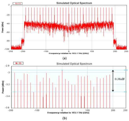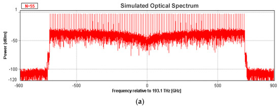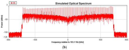 In the simulation, the output power, center frequency, and linewidth of the seed laser are 0 dBm, 193.1 THz, and 1 MHz, respectively. All the DDMZMs are in push–pull mode, and the half-wave voltage , the extinction ratio is set to 30 dB. The range of noise figure for an amplifier is generally 4~6 dB; in this simulation, the noise figure is set to 4 dB. Flatness is defined as the maximum power difference between the comb lines.