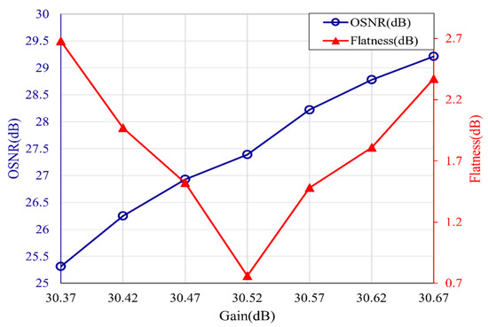 Figure 5 shows the flatness and optical signal-to-noise ratio (OSNR) of the 111-line optical frequency comb under different EDFA gains. It can be seen that the flatness varies with the gain values, and there is an optimal gain of 30.52 dB at which the flatness is the best; the best flatness is 0.76 dB when the EDFA gain value is set less than or greater than the optimal gain, the flatness will become worse, for example, the flatness is greater than 2 dB when the gain is set to 30.37 dB and 30.67 dB. At the same time, Figure 5 shows that the OSNR of the comb line is increasing with the EDFA gain.