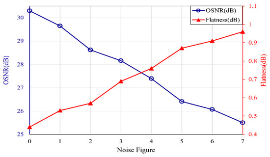 Noise figure is also an important parameter in EDFA; it has an influence on the generated optical frequency comb; here, taking the generation of 111-line optical frequency comb as an example as before to analyze the influence of noise figure on the flatness and OSNR of the generated optical frequency comb.