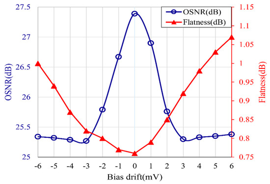 DDMZMs are important devices in the generation system, and the DC biases applied to the modulators need to be precisely controlled, but the DC bias voltages may deviate from the ideal values in the practice situation due to ambient temperature change. The above simulations are based on the ideal situation in that the DC bias voltages of the modulators are at the correct values. Therefore, it is necessary to analyze the influence of DC bias drifts on the performance of the generated OFC. For the sake of convenience, taking the generation of 111-line optical frequency comb as an example as before to analyze the influence of the DC bias drifts on the OSNR and flatness of the comb lines. In the simulation, the drift range of DC bias voltage is set to −6 mV~6 mV. The simulation result is shown in Figure 7.