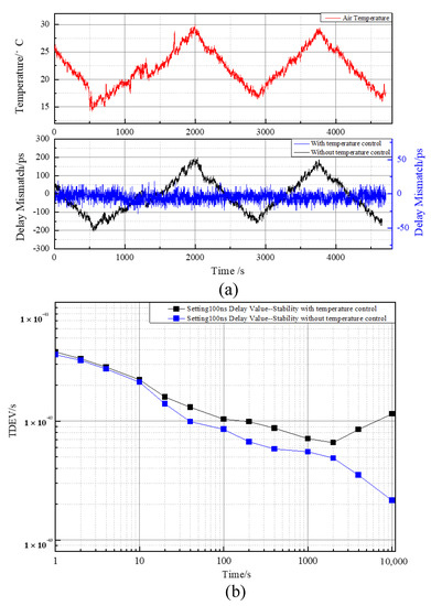 Further, to analyze the stability of the compensation system, the delay was set to 100 ns, and 24-h data were collected. The stability of the 1-PPS signal output when the processed delay compensation control module was applied is shown in Figure 4b. The black curve in Figure 4b shows the TDEV results of the uncontrolled temperature delay compensation system, in which the TDEV was 4.1 ps/1 s and 1.14 ps/10,000 s; the blue curve shows the TDEV results of the temperature control delay compensation system, which showed a TDEV of 3.8 ps/1 s and 0.36 ps/10,000 s. Therefore, the benefit of the temperature control of the delay compensation system for long-term stability was obvious.