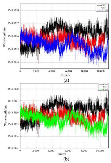 As shown in Figure 6a (C35 channls) and Figure 6b (C36 channls), the wavelengths of all 32 lasers were measured and calibrated one-by-one using a wavelength meter, and the error was less than 0.0003 nm. To avoid the influence of laboratory temperature change (peak-to-peak value of 2 C/day [31]) on the output wavelength of a laser, the external temperature of the laser was controlled to ensure the change in the output wavelength with ambient temperature was less than 0.0001 nm/C.