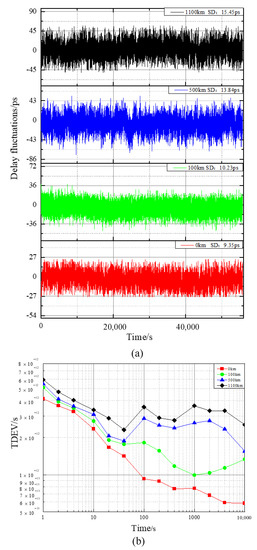 (a) Instability of the propagation delay of the optical fiber link with a length of 0–1100 km. (b) TDEV results of the 1-PPS time transfer for different length laboratory-tested links with the propagation delay stabilization.