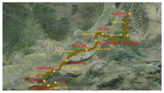 In the next experiment, the proposed system was tested on a real fiber network, which is part of the standard telecommunication infrastructure in the urban environment. As shown in Figure 8, a fiber loop provided by China Telecom, running from the laboratory at the Lin Tong Campus of NTSC, leading to the Lin Tong Telecom engine room, Er Chang, Yan Liang, Pu Cheng, He Yang, Han Cheng, He Jin, Xin Jiang, Lin Fen, and returning back to the laboratory, was used.