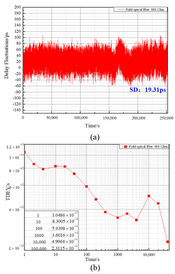 The instability of the propagation delay of the 988.52-km field optical fiber link is shown in Figure 9a. The experimental results show that the measured time difference varied with the peak-to-peak value of 176 ps near the SD of 19.3 ps.