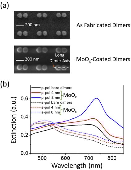 Transversal polarization extinction curves exhibits a slight LSPR spectral redshift with the increase in the oxide thickness from 495 nm of bare dimers to 515 nm with 8 nm of MoOx as an effect of the increased refractive index of the surrounding medium []. A slight intensity variation is observed in this case.