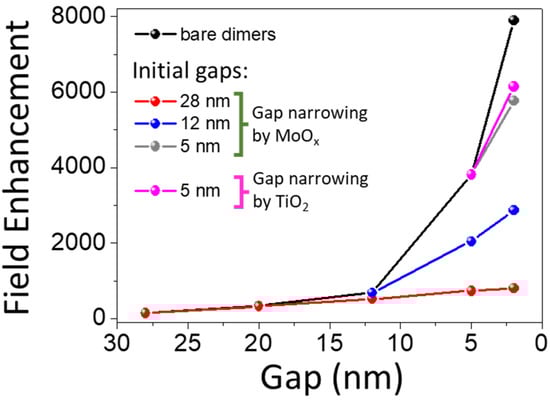 Thanks to the rapid development of nanofabrication techniques, the production of ultranarrow metallic nanogaps is now feasible. For example, sub-10 nm gaps can be directly fabricated by high resolution electron beam lithography (EBL) or focused-ion beam (FIB) milling [,,]. However, such direct fabrication strategies are not ideal options to fabricate sub-5 nm gaps; therefore, extremely high local field EFs [,] could not be easily attained. Conversely, the dielectric coating by ALD of initial nanometer-sized gaps can represent a reproducible and precise nanofabrication technique capable of producing sub-5 nm gaps. In this context, it can be of practical interest to understand the trade off between the initial gap of Al bare dimers and the maximum EM field achievable in the hot spot with the ALD dielectric coating. To shed light on that topic, a few initial Al dimer nanogaps were considered, and the EM field in the hot spot was numerically calculated by progressively narrowing the initial gaps with a dielectric coating down to a 2 nm gap. Figure 3 reports the exponential increase in the simulated EM field from |E/E0|2 = 146 up to 8063, by narrowing the Al dimer gaps from 28 nm down to 2 nm, respectively. As it can be noted, by considering a progressive MoOx coating over three initial nanogaps of 28, 12 and 5 nm, a beneficial role of the dielectric shell is observed. This is revealed by a larger EM field enhancement within the hot spots, with respect to the initial EM field values. However, the MoOx-coated dimers with an initial gap of 5 nm attain large EM field values, in particular, the EM field linearly increases with a slope of 652 nm−1 with respect to the values of 218 and 25 nm−1 for the initial gaps of 12 and 28 nm, respectively. Furthermore, the percentage of EM field enhancement as function of the percentage of narrowed gap (by MoOx ALD deposition), with respect to bare dimers for three initial nanogaps of 28, 12 and 5 nm, was reported in Figure S4. The latter demonstrated that the developed process is extremely efficient in the case of large initial nanogaps. Indeed, a field enhancement by more than 250% for 60% of a closed gap was attained for an initial gap of 28 nm. Conversely, a limited field enhancement (of around 50%) was obtained for the same percentage of closed gap (60%) for a narrower initial gap as low as 5 nm.