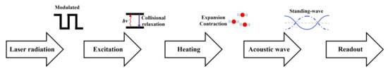 These considerable advantages of photoacoustic spectroscopy have led to a competitive benefit over other absorption spectroscopy technologies. As shown in Figure 1, the photoacoustic effect on gases consists of four stages [26]: (i) modulation of the laser radiation (both amplitude and frequency) at a wavelength for which the target species shows high absorption; (ii) excitation of the target molecules by absorption of the incident radiation; (iii) non-radiative transfer of the absorbed radiation energy via collisions with other molecules, hence resulting in periodic heating at the modulation frequency; and (iv) detection of the acoustic waves produced by the periodic heating with sensitive microphones or pressure sensors.