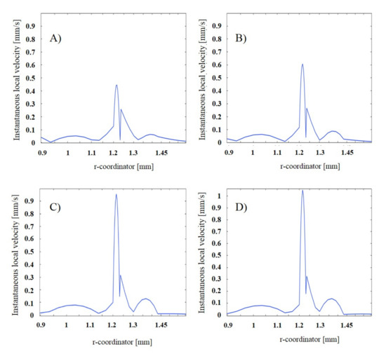 Since the resonance frequency is directly related to the acoustic velocity, the local acoustic velocity at the resonant frequencies of the mentioned gases in Figure 4 were examined and the obtained results are shown in Figure 5. The r-coordinator in Figure 5 is the length of the resonator; the peaks are related to the frequency resonances of the resonators. The change in the peak of the frequency due to the change in acoustic velocity was different from the composition of the gas. It should be noted that the photoacoustic response of air components such as N2, O2, and CO2 was also simulated: 18.101 kHz for CO2; 23.684 kHz for N2; and 22.112 kHz for O2. Based on the results, these components have a frequency very different from the frequency of pollutants.