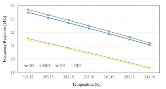 Temperature was one of the factors that affected the resonance frequency, as the acoustic velocity increased with temperature T [48,49]. Therefore, temperature changes could cause a change in the resonant frequency of PA cells. The effects of temperature on the sensor in the temperature range of 243 to 303 degrees Kelvin were studied specifically to investigate their effects on the frequency response. Figure 6 shows the rate of change in the frequency response for temperature change. Temperature monitoring was necessary to ensure that the PS cell was working in resonance mode.
